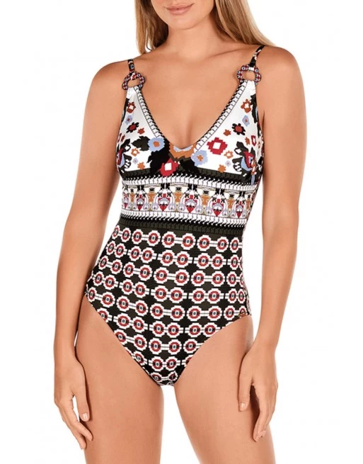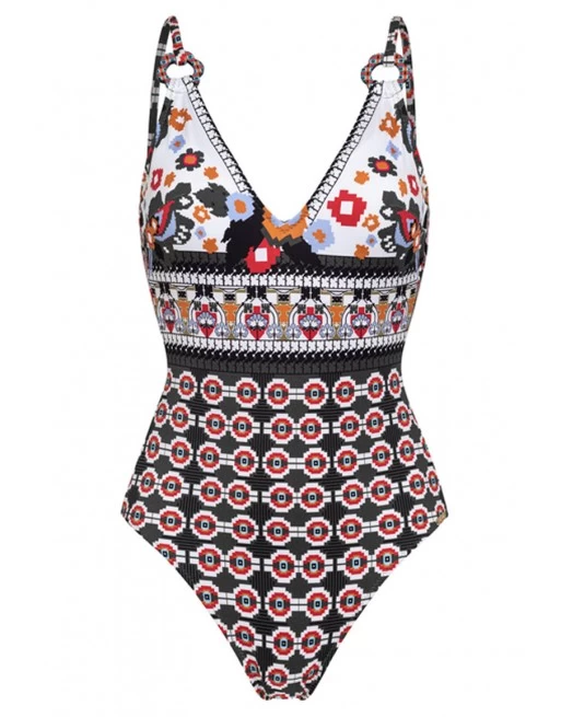 Dit Dolores Cortés badpak zonder beugel is uitgevoerd in een moderne geometrische print.