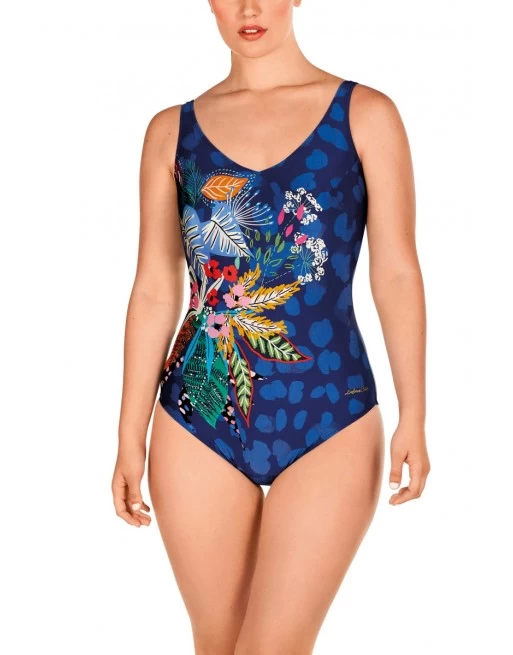 Dit badpak van Dolores Cortés, uitgevoerd in een fleurige multiprint op een klassiek blauwe achtergrond