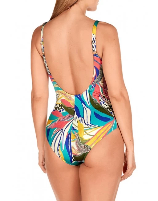 Dit Dolores Cortés badpak zonder beugel is uitgevoerd in een elegant kleurenpalet van turquoise, geel, wit, koraal en kobaltblauw.
