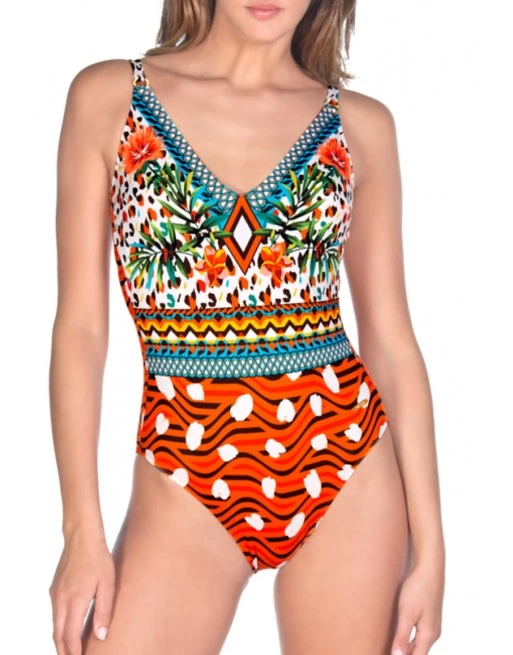 Dit badpak van Dolores Cortés is uitgevoerd in een fleurige opvallende print.