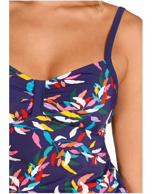 Dolores Cortés tankini zonder beugel met schuimgevulde beha cups is uitgevoerd in een zonnige multi print op een donkerblauwe basis.