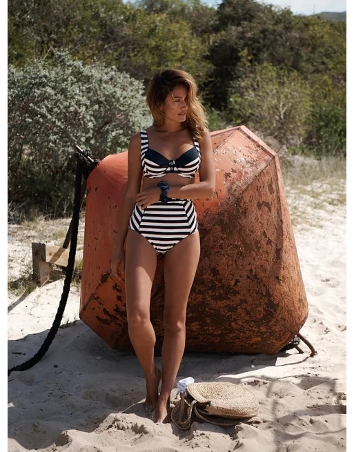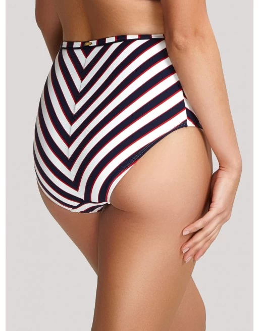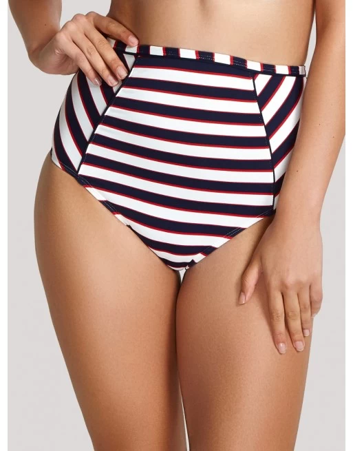 Voor deze lente – zomer collectie is Lucille bikini slip van Panache Swim met een klassieke pasvorm uitgevoerd in een nautisch marine, met ivoor – rode streep en afgewerkt met gouden details voor een tijdloze look, perfect voor elke zon zoeker.