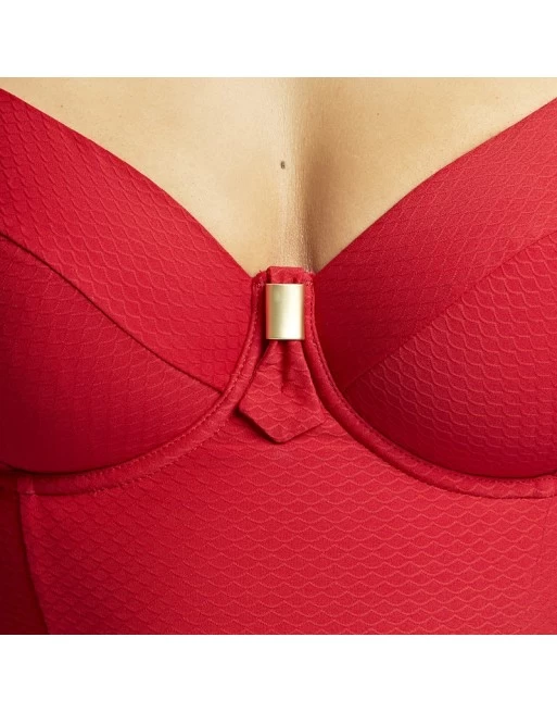 Het balconnet badpak heeft een ondersteunende cupvorm, afgewerkt met matgouden details.